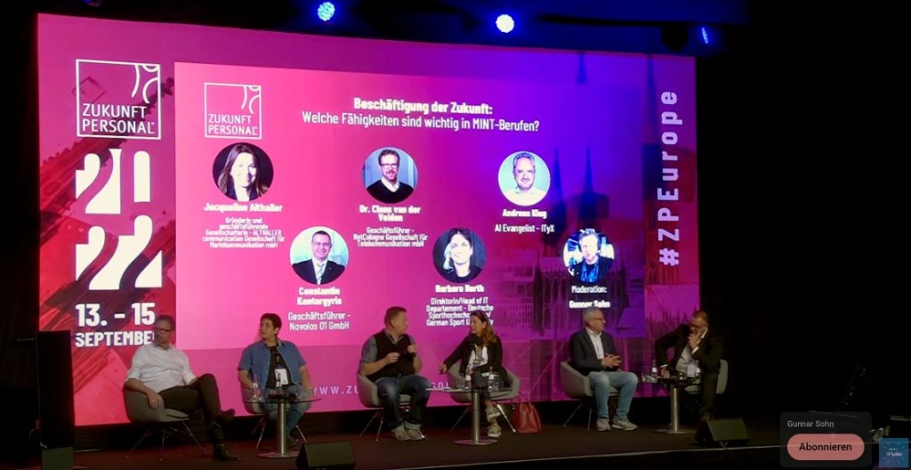 MINT-Berufe in Verbindung mit königlicher Weitsicht können Mathematik, Informatik, Natur- und Ingenieurwissenschaften sowie Technik attraktiver machen. Dieses Thema wurde auf der Zukunft Personal Europe in Köln auf der Keynote Stage diskutiert. Das Panel bestand aus Barbara Barth (Sporthochschule Köln), Jacqueline Althaller (Althaller Communication), Andreas Klug (Bitkom und Ityx), Constantin Kontargyris (Novolos) und Claus van der Velden (Netcologne).