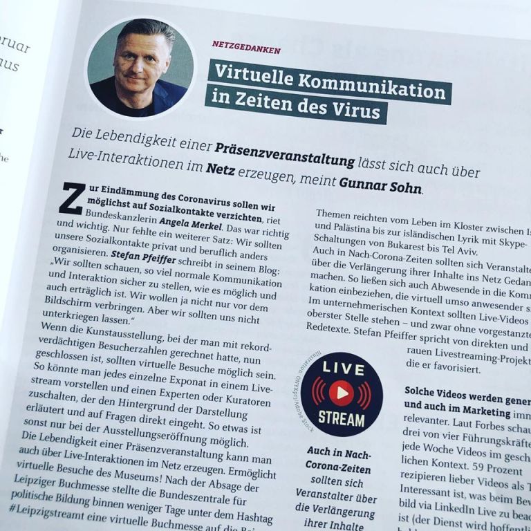 Wir sollen möglichst auf Sozialkontakte verzichten, verkündete die Bundeskanzlerin zur Eindämmung des Corona-Virus. Das war richtig und wichtig. Nur fehlte ein weiterer Satz: Wir sollten unsere Sozialkontakte privat und beruflich anders organisieren. „Wir sollten schauen, so viel normale Kommunikation und Interaktion sicher zu stellen, wie es möglich und auch erträglich ist. Wir wollen ja nicht nur vor dem Bildschirm verbringen. Aber wir sollten uns nicht unterkriegen lassen“, schreibt Stefan Pfeiffer in seinem Blog.