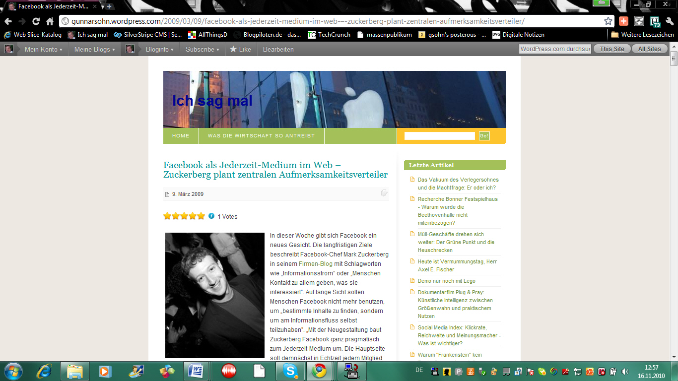 Ich selbst habe eine Story für den Fachdienst Service Insiders geschrieben und mich auf die „wahren Ziele“ von Facebook-Chef Mark Zuckerberg konzentriert: Mit dem Projekt „Messages“ will Zuckerberg keinen E-Mail-Killer etablieren, sondern ein Imperium der Aufmerksamkeitsverteilung schaffen, berichtet der Düsseldorfer Fachdienst Service Inside in einer Vorabmeldung. Bereits jetzt verlassen viele Nutzer den Facebook-Mikrokosmos nicht mehr. Der Blogger und Werbeberater Sascha Lobo spekulierte schon Anfang 2009 über den nächsten logischen Schritt von Facebook: Die Entwicklung eines echten eigenen Browsers, „der ganz nebenbei dazu führen würde, dass man die Community überhaupt nicht mehr verlässt”, erklärte Lobo damals.