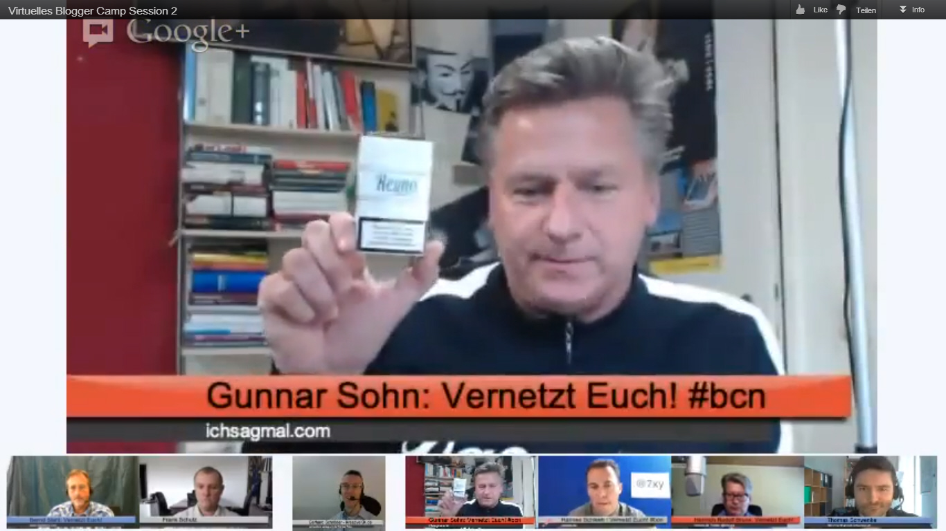 Ich freue mich auf die Fortsetzung des virtuellen Blogger Camps als ständige Einrichtung an jedem letzten Mittwoch des Monats. Start am 24. Oktober. Jeweils zwei Sessions. Die erste von 18,30 bis 19,00 und die zweite von 19,30 bis 20,00 Uhr. Technik und Admin macht Hannes Schleeh (man sollte ihn in die eigenen Google Plus-Kreise aufnehmen – Hannes ist auch bereit, vor den Live-Hangouts Testrunden durchzuführen und Ton, Bild und Beleuchtung zu überprüfen – hat sich in der Vorbereitung des ersten virtuellen Blogger Camps am vergangenen Freitag bewährt). Moderation: Icke.