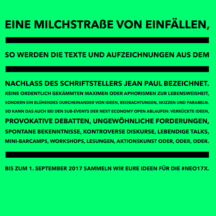 In einigen Tagen starte ich offiziell die diesjährige Kampagne der Next Economy Open #NEO17x, die am 9. und 10. November stattfindet. Bin gespannt, was wir wieder für spannende Subevents realisieren. Da ist Ideengewimmel gefragt. Habt Ihr Lust, bei der #NEO17x mitzumachen?