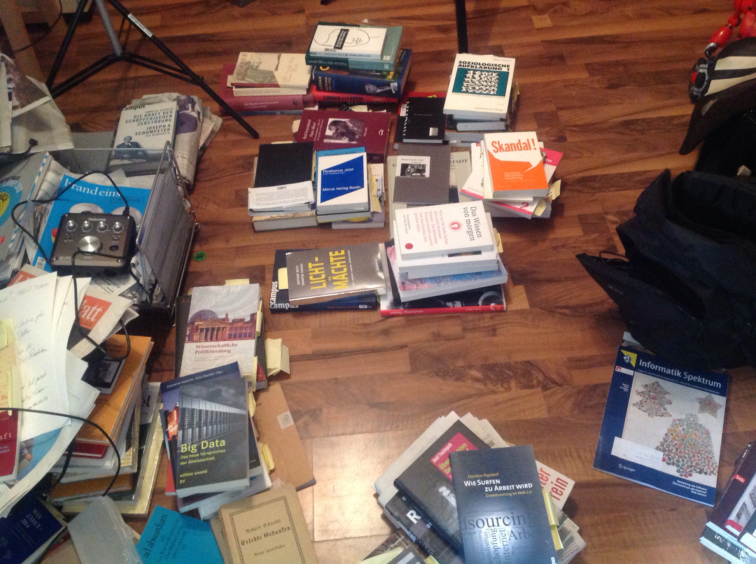 Die Gesamtheit der Notizen lasse sich nur als Unordnung beschreiben, immerhin aber als Unordnung mit nichtbeliebiger innerer Struktur – das würde meinen Bücherhaufen entsprechen, die ich immer wieder nach neuen Themen zusammen stelle.