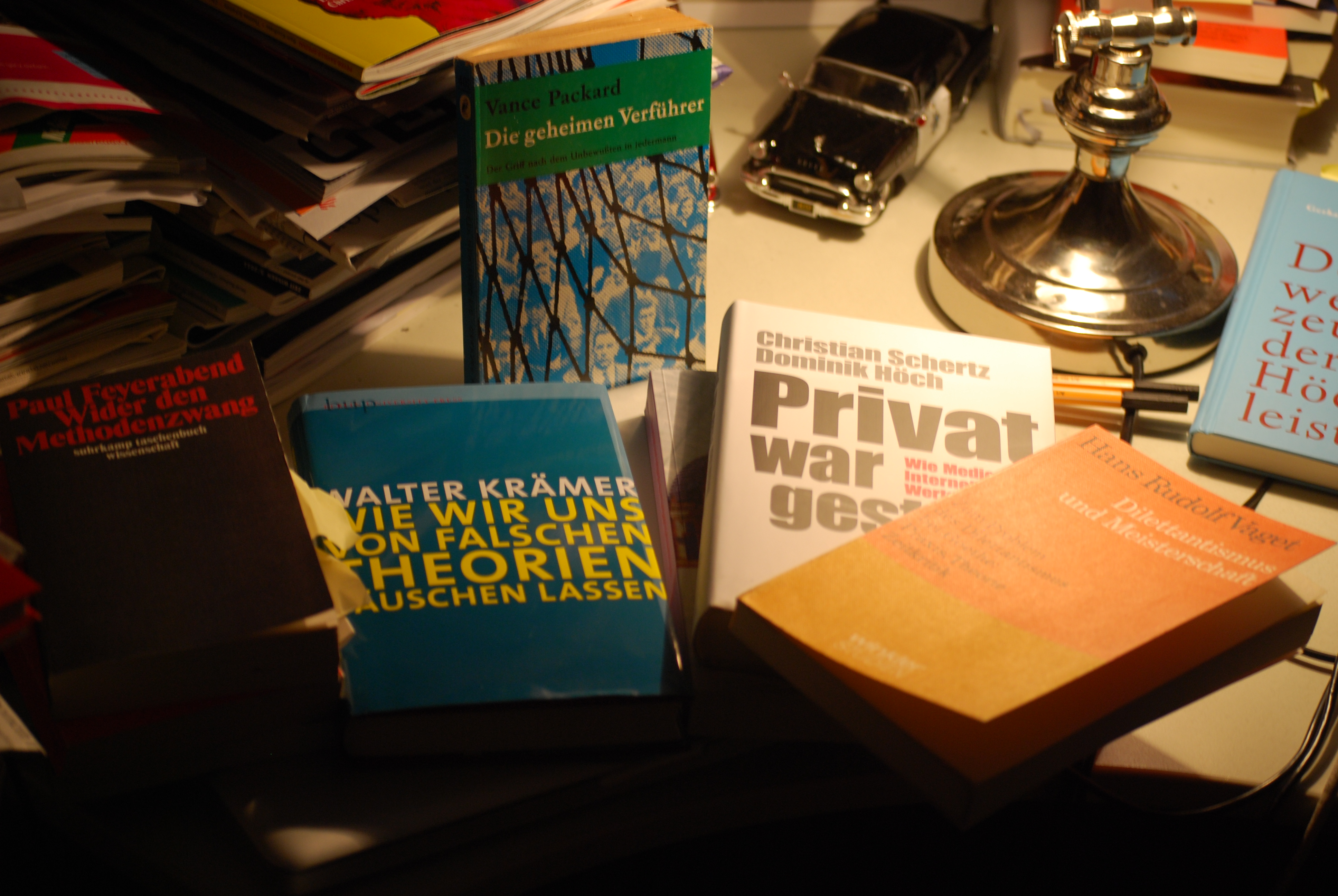 Oder man greift zum Buch „Wider den Methodenzwang“ meines Lieblingsphilosophen Paul Feyerabend. Erfrischend sein Bekenntnis zum Dadaismus. Das einzige, wogegen sich der Dadaist eindeutig und bedingungslos wendet, sind allgemeine Grundsätze, allgemeine Gesetze, allgemeine Ideen wie „die Wahrheit“, „die Vernunft“, „die Gerechtigkeit“, „die Liebe“ und das von ihnen hervorgerufene Verhalten, wenn er auch nicht bestreitet, dass es oft taktisch richtig ist, so zu handeln, als gäbe es derartige Gesetze und als glaube er an sie. Der Dadaist vereint Vernunft und Unvernunft, Sinn und Unsinn, Plan und Zufall – sie gehören als notwendige Teile eines Ganzen zusammen. Denn letztlich ist alles ein Produkt unserer schöpferischen Einbildungskraft und nicht das Ergebnis eines Universums von Tatsachen.