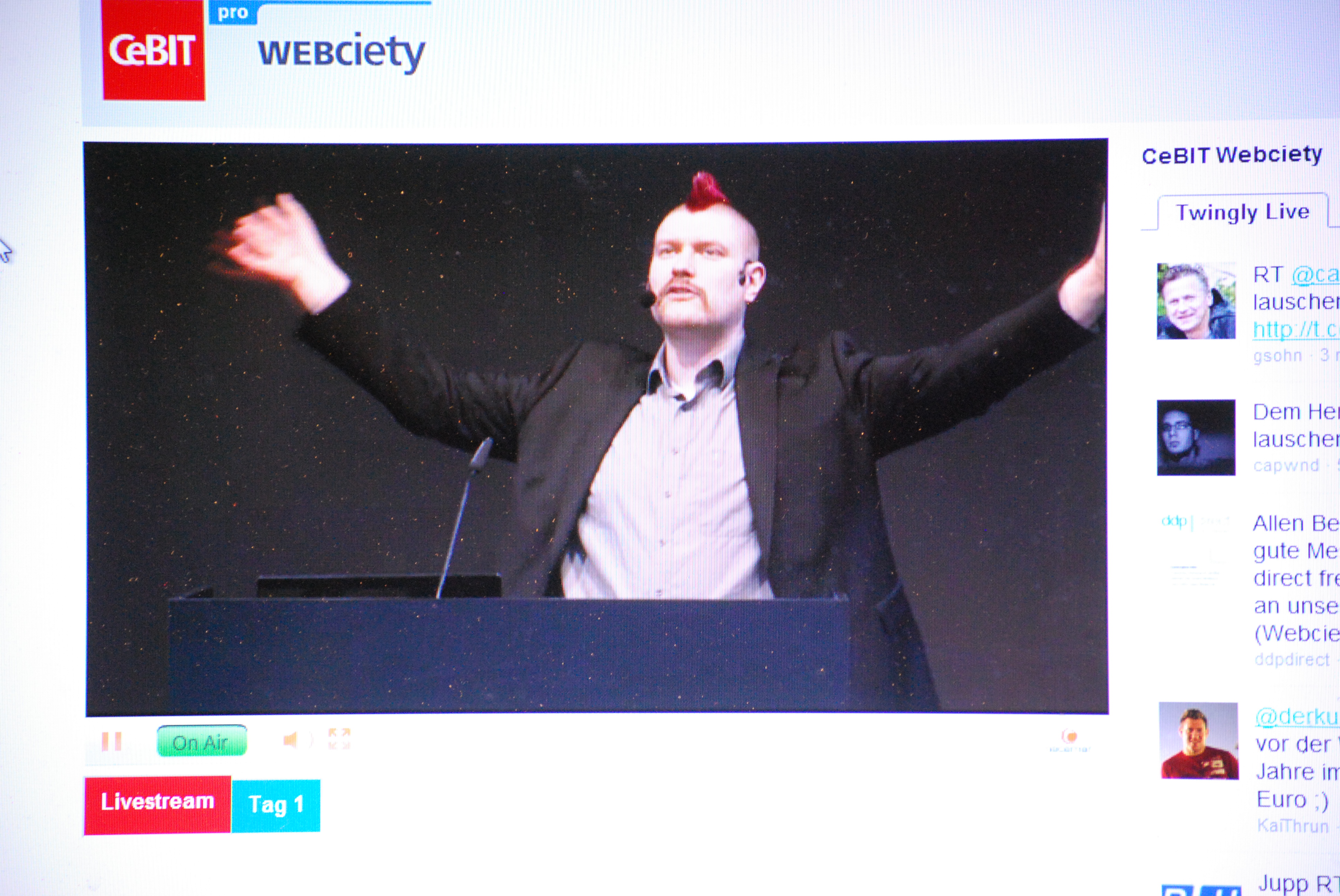 In den Mittagsstunden habe ich mal über meinen Laptop den Webciety-Vortrag von Sascha Lobo auf der Cebit und die anschließende Diskussion mit Thomas H. Kaspar von Chip Xonio Online (Moderation: Björn Negelmann) aufgezeichnet. Thema: Das Web als das soziale Betriebssystem. Den Start des Vortrags hatte ich verpennt. Dürften aber nur wenige Minuten sein. Zwischendurch ist auch mal mein Bürostuhl, der Fotoapparat und ein Zwischenruf aus der oberen Etage zu hören – das sollte Euch aber nicht stören.