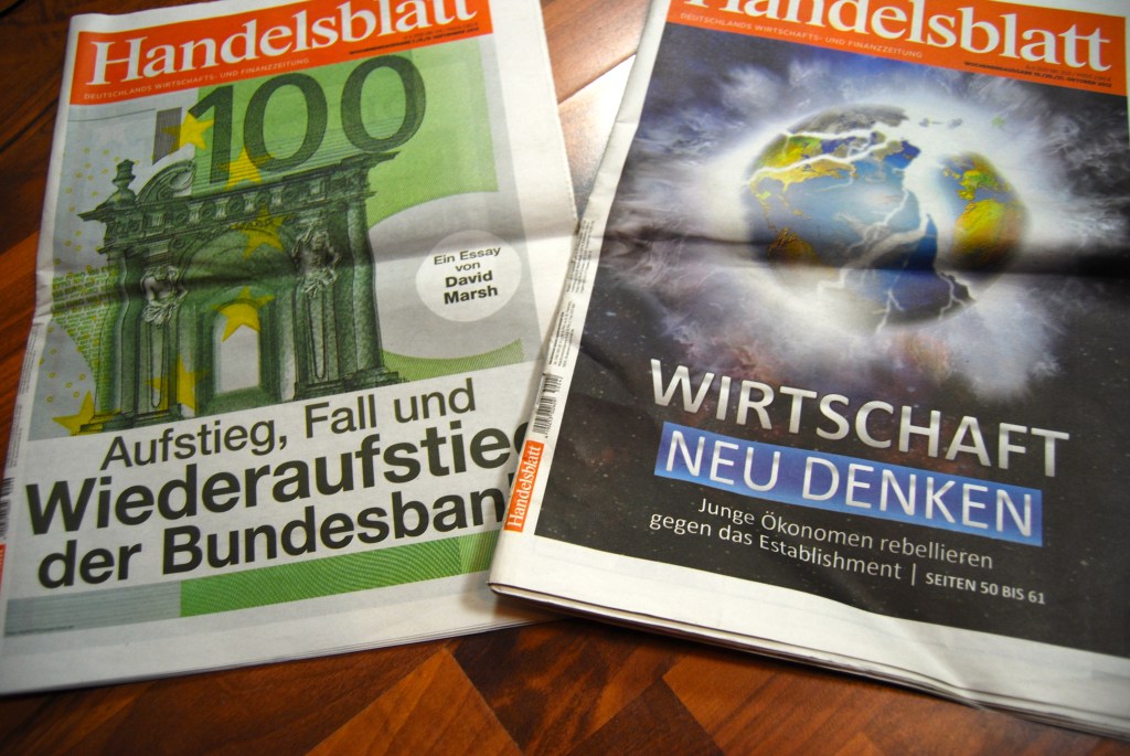 Das ist übrigens auch ein Problem beim Handelsblatt. In den vergangenen Monaten habe ich zwei Ausgaben gekauft. Jeweils am Freitag. Es lag nur an den Schwerpunktgeschichten – deshalb bin ich ja auch ein Stammleser der Zeitschrift brand eins. Es waren die Wochenend-Titel über „Wirtschaft neu denken“ „Aufstieg, Fall und Wiederaufstieg der Bundesbank“, die mich zum Kauf animierten.