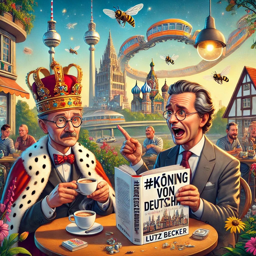 Im Sommer der Zukunft, in einem charmanten Café in Wuppertal, umhüllt von einem üppigen Garten voller blühender Blumen und summender Bienen, treffen sich Lutz Becker und Gunnar Sohn. Die Luft ist warm und duftet nach frisch gebrühtem Kaffee, während ein sanfter Wind durch die offenen Fenster weht und die Gespräche der Gäste untermalt. Hier, in dieser idyllischen Oase, stellen sie ihr Werk „#KönigVonDeutschland“ vor, ein Buch, das aus einer Vielzahl von Gesprächen, Überlegungen und kühnen Visionen entstanden ist.
