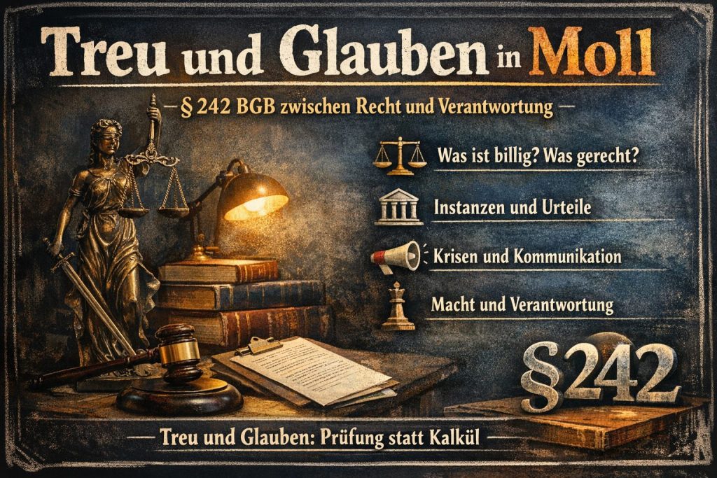 Wenn Felder „Einigkeit und Recht und Freiheit“ aufruft, klingt darin eine alte Einsicht: Ohne Rechtsbindung keine Freiheit. Recht ist nicht Dekoration der Politik, sondern ihre Grenze – und manchmal ihr Korrektiv. In dieser Perspektive erscheint § 242 wie eine zivile Miniatur derselben Idee: Nicht die Laune des Tages, nicht die formale Machtposition, sondern die Bindung an eine Grundethik des Umgangs.