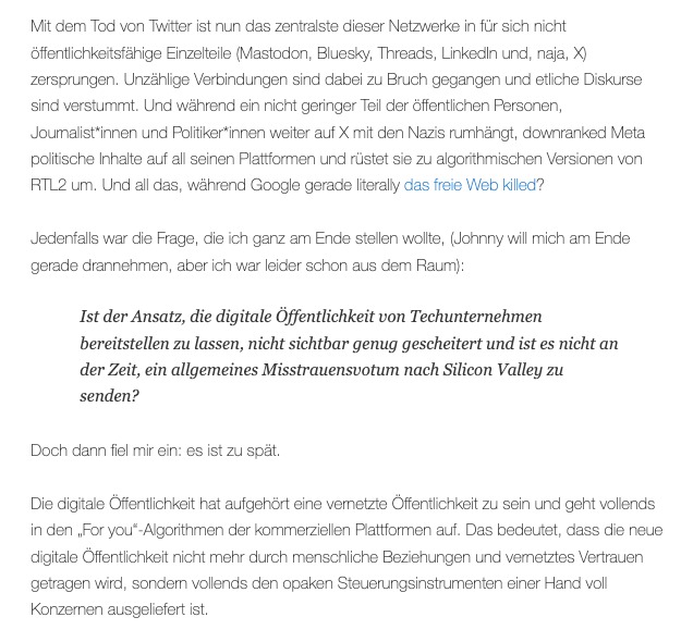 Die digitalen Plattformen, die Seemann kritisiert – TwitterX, Facebook, LinkedIn, YouTube und auch neuere wie Mastodon – sind letztlich privatisierte Öffentlichkeiten. Diese Plattformen bieten ihre Dienste größtenteils kostenlos an, finanziert durch Werbung, Abos, Spenden, Sponsoring und dergleichen mehr. Die Regeln, die dort gelten, ähneln denen eines Kaufhauses: Wer gegen die AGBs verstößt, riskiert Sanktionen bis hin zur Verbannung – das gilt auch für Mastodon mit vielen kleinen Fürstentümern. Diese Maßnahmen mögen oft willkürlich und ohne ausreichende Widerspruchsmöglichkeiten erscheinen, doch sind sie schon immer integraler Bestandteil des Systems, das uns Zugang zu diesen Plattformen gewährt. Hier wäre in der Tat die Politik gefragt, um eine Art von Internet-Governance zu etablieren, ähnlich der ICANN. Fordern wir ja schon seit Ewigkeiten: