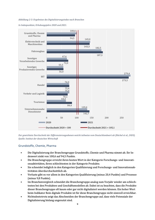Im Auftrag des Bundesministeriums für Wirtschaft und Klimaschutz wurden in einem Index die Stärken und Schwächen von Unternehmen bei der Digitalisierung analysiert. Besonders schwach schneidet die Branche für Logistik und Verkehr ab. Der Indexwert in der Branchengruppe Verkehr und Logistik sinkt von 75,4 auf 70,1 Punkte. Die Branchengruppe erreicht ihr bestes Ergebnis in der Kategorie Prozesse, ihr schlechtestes bei den Forschungs- und Innovationsaktivitäten. Die Prozesse sind die einzige Kategorie, in der Verkehr und Logistik einen überdurchschnittlichen Wert erzielt. Sie gewinnt dort 20,2 Punkte hinzu. Verluste werden bei Produkten (minus 32,0 Punkte), Geschäftsmodellen (minus 20,1 Punkte) und in der Qualifizierung (minus 6,8 Punkte) verzeichnet. Verkehr und Logistik bilden 2021 wie auch 2020 das Schlusslicht in der Kategorie
