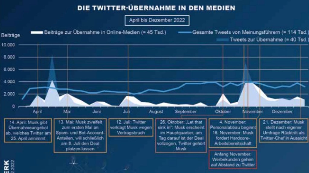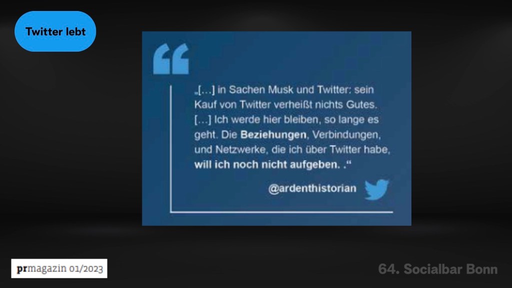 Die größten Reichweiten und Interaktionen erzielen die Kanäle großer Medieninstitutionen (Tagesschau, Welt etc.). Der Deal bewegt die Gemüter und führt zu höherer Aktivität bei Twitter, nicht aber zu einem anschließenden Weggang der User. Vielmehr ziehen diese, begünstigt durch die Strukturen der Plattform, schlicht zu den nächsten Themen weiter. Annika Brockschmidt unterstreicht das Alleinstellungsmerkmal der Plattform, Inhalte in 280 Zeichen prägnant zu transportieren. In einem Tweet drückt sie aus, was sich bei der Datenanalyse als vorherrschendes Sentiment herauskristallisiert: Die Übernahme durch Musk mag auf vielen Ebenen kritisch zu sehen sein, aber die über lange Zeit auf Twitter aufgebauten Beziehungen sind es wert, an ihnen festzuhalten, solange es geht.
