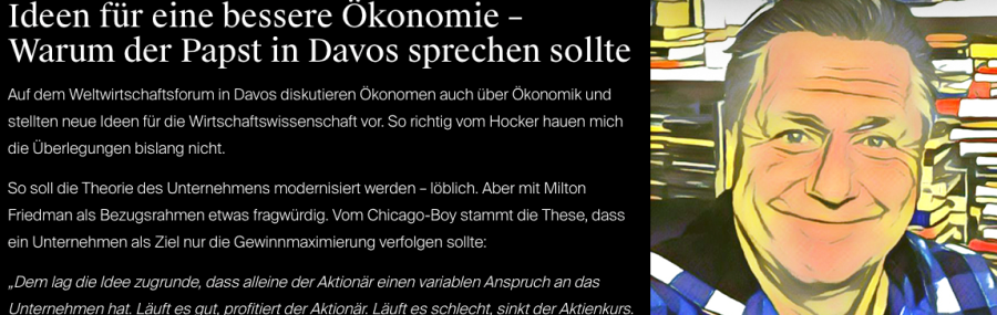 „Dem lag die Idee zugrunde, dass alleine der Aktionär einen variablen Anspruch an das Unternehmen hat. Läuft es gut, profitiert der Aktionär. Läuft es schlecht, sinkt der Aktienkurs. Sowohl Anleihegläubiger als auch Beschäftigte hatten in der Diktion von Friedman feste Ansprüche an das Unternehmen wie Zinsen (Anleihegläubiger) oder Lohn (Beschäftigte). Unser Ökonom in Davos bezeichnete Friedmans Konzept als ökonomisch im Prinzip überzeugend und damit als Referenz geeignet, aber auch als zu eng. Er gab zu bedenken, dass es neben den Aktionären auch noch andere Gruppen gibt, die langfristig in ein Unternehmen investieren, zum Beispiel treue Lieferanten oder Arbeitnehmer, die nicht wechseln. Er regte an zu überprüfen, ob die Theorie des Unternehmens nicht in diesem Sinne breiter mit Blick auf alle Parteien, die langfristig in ein Unternehmen investieren, ausgearbeitet werden sollte“, so FAZ-Wirtschaftsredakteur Gerald Braunberger.