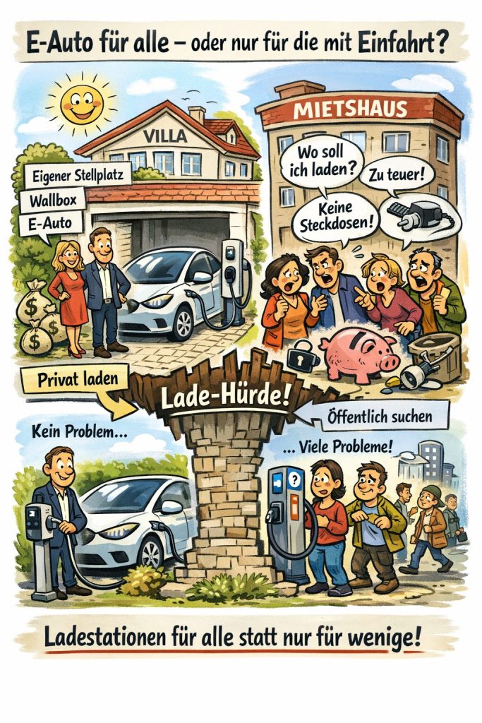 Etwa 70 % der Wohnungen liegen in Mehrparteienhäusern, oft vermietet – und genau dort wird Laden zum Drama: Eigentümerversammlung, Vermieterblockade, Netzkapazität, Kostenumlage, Haftungsfragen. Drei Jahre Diskussion für eine Wallbox, während die Politik vom „Hochlauf“ spricht.