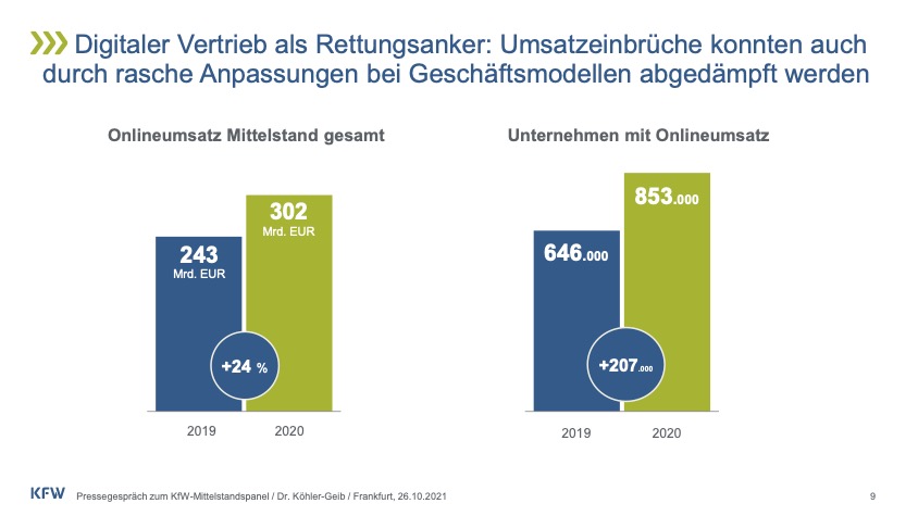 „Zwar sind die Umsätze damit in der Gesamtsicht merklich zurückgegangen, gemessen am Vergleichswert der Wirtschafts- und Finanzkrise von -6,2 Prozent im Jahr 2009 sowie an der grundsätzlich breiten Corona-Betroffenheit im Mittelstand scheinen die Verluste allerdings überschaubar“, so die Analyse des KfW-Mittelstandspanel. Durch die Verlagerung von Konsum konnten auch einige Mittelstandssegmente von der Krise profitieren. Das betraf vor allem den Lebensmitteleinzelhandel, Drogerien, den Onlinehandel, Lieferdienste und Logistikdienste, die Pharmaindustrie aber auch Onlinedienste und Softwareunternehmen. Ebenso haben sich rasche Anpassungen bei Geschäftsmodellen und vor allem ein starkes Wachstum von digitalen Vertriebskanälen vielfach als Rettungsanker erwiesen und Schlimmeres verhindert. Der weitaus größte Anteil an den aggregierten Umsatzverlusten im Mittelstand entfällt auf Unternehmen der „Sonstigen Dienstleistungen“. In diesem Segment (darunter fallen 35 Prozent aller Mittelständler) gibt es nicht nur zahlreiche Überschneidungen mit dem stationären Einzelhandel. Zudem zählen Unternehmen der körpernahen Dienstleistungen, Gastronomie und Gastgewerbe, weite Teile des Tourismus, Pflege, Aus- und Weiterbildung sowie Kultur und Sport dazu – allesamt Wirtschaftszweige, die in hohem Maß von Corona-Eindämmungsmaßnahmen betroffen waren. Dort summieren sich die Verluste auf Jahressicht auf rund 161 Milliarden Euro.