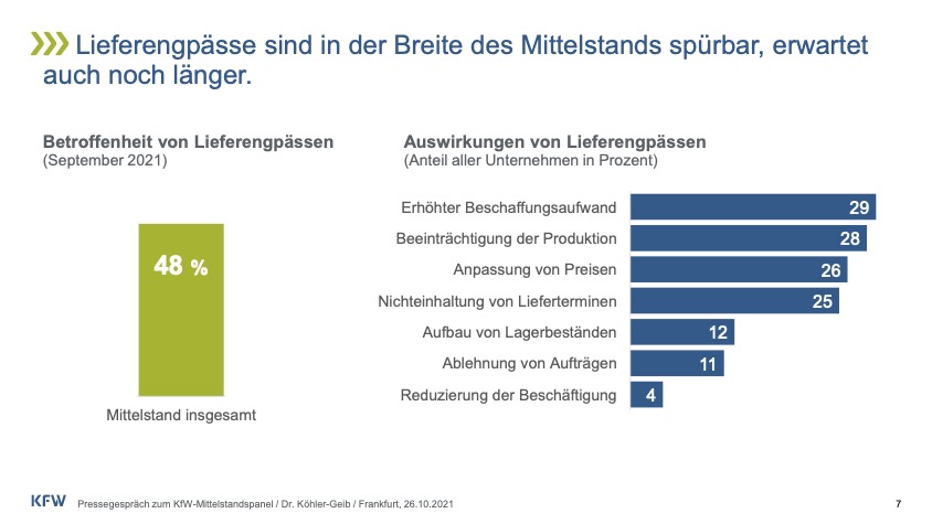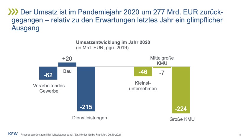 „Ein großer Teil dieser Umsatzverluste dürfte insbesondere auf den ersten Lockdown in den Frühjahrsmonaten 2020 zurückgehen. Mit der schrittweisen Aufhebung der Eindämmungsmaßnahmen folgte zwar eine kräftige Erholung über den Sommer. Aber trotz dieser Aufholjagd haben sich die hohen Umsatzverluste der ersten Jahreshälfte für die kleinen und mittleren Unternehmen nur begrenzt wieder aufholen lassen. Vor allem aufgrund der im Herbst wieder gestiegenen Infektionszahlen und der damit einhergehenden neuerlichen Eindämmungsmaßnahmen ab November. Im Unterschied zum Frühjahr war der gesamtwirtschaftliche Schaden dieses Mal aber geringer. Zwar gab es wiederum Geschäftsschließungen im Gastgewerbe, bei Kunst, Unterhaltung und Erholung sowie bei den meisten persönlichen Dienstleistungen. Der Einzelhandel blieb dagegen geöffnet und die Industrieproduktion nahm vor dem Hintergrund der globalen Erholung ohne nennenswerte Störung in den Lieferketten weiter zu. An einen ‚Normalbetrieb’ war für sehr viele Unternehmen – insbesondere solche mit einem engen Kontakt zu Endkunden – nahezu das ganze Jahr über allerdings nicht zu denken. Aufgrund der Abstands- und Hygieneregeln konnten Kapazitäten häufig nicht voll ausgeschöpft werden. In der Folge entschieden sich sogar einige Unternehmen trotz einer Möglichkeit zu öffnen, dies nicht zu tun.“