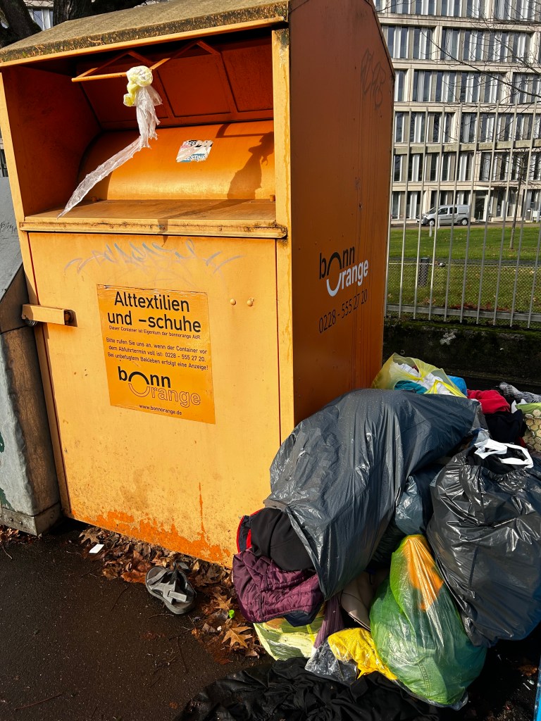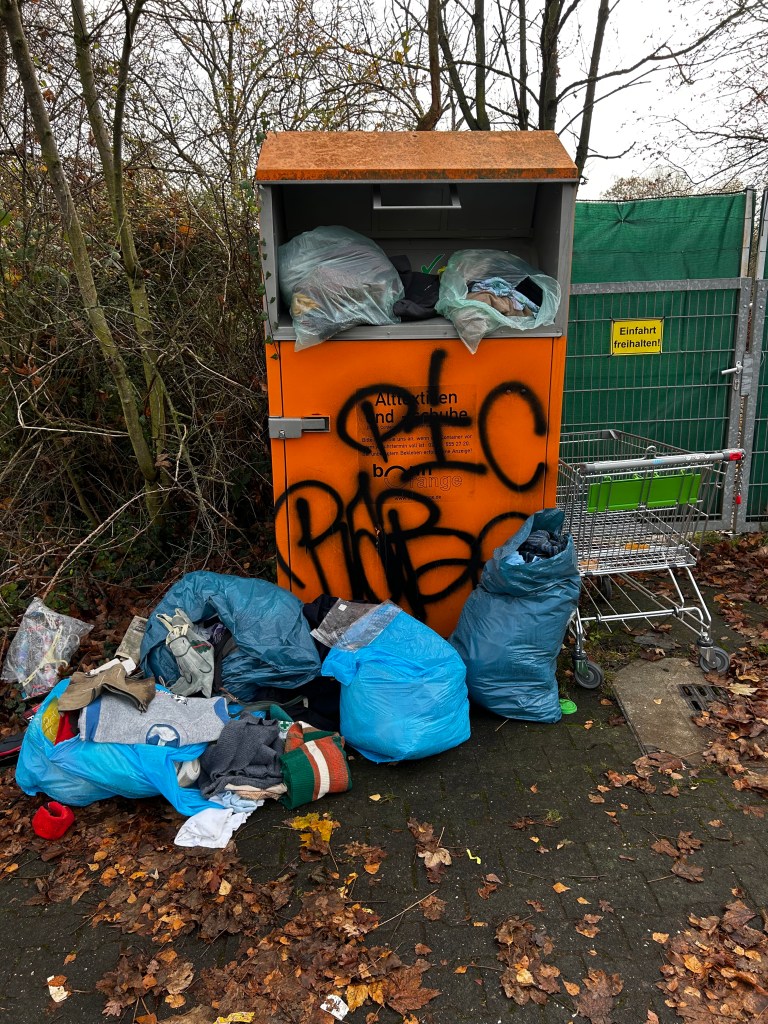 Drei Altkleidercontainer. Drei Straßen in Bonn. Drei Bilder derselben Ohnmacht: Müllberge, aufgerissene Säcke, Wind, der die Reste durch den Stadtteil trägt. Keine fünf Minuten liegen zwischen den Fundstellen, kein System scheint dazwischen. Es ist die Rückkehr des Analogen in seiner dysfunktionalsten Form.