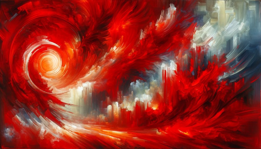 Dieses Gemälde zeigt eine explosive Verwendung von Rot, das in alle Richtungen zu strömen scheint. Die kräftigen Pinselstriche und die verschiedenen Rottöne symbolisieren eine seelische Eruption, einen Ausbruch von unterdrückten Emotionen und innerer Kraft.