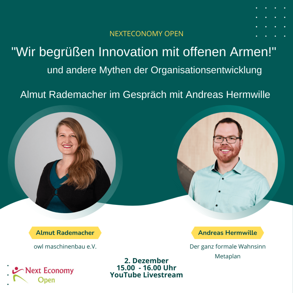 Über diese und weitere vermeintliche Wahrheiten der Organisation spricht @ Almut Rademacher, Geschäftsführerin von @ owl maschinenbau, mit @ Andreas Hermwille, Metaplaner und Moderator Podcasts „Der ganz formale Wahnsinn“.